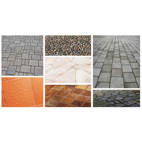 - Dallages et sols extérieurs : pavés autobloquants, pierres naturelles ou reconstituées, bétons bruts ou teintés, terres cuites, tomettes, etc…