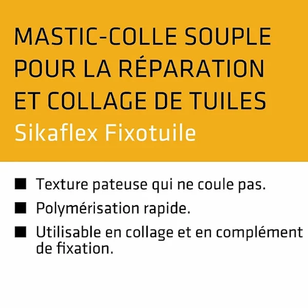 Le Sikaflex Fixotuile est un excellent produit. Il est trĂšs efficace pour la fixation des tuiles en terre cuite.