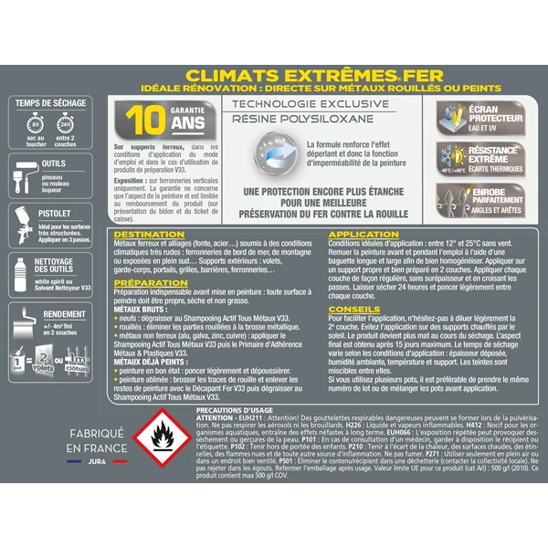 Cette peinture Fer Climats Extrêmes® a été spécialement conçue pour peindre des pièces en métal soumises à des conditions climatiques très rudes.