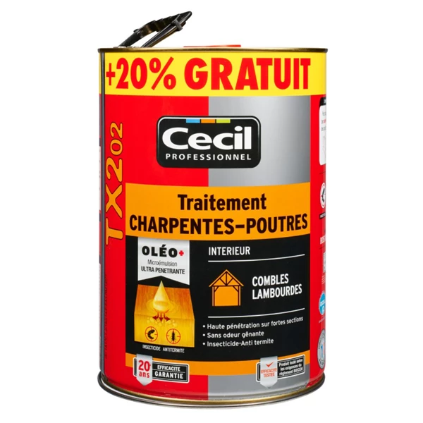 | Conditionnement | 1 bidon de 5 litres + 20% gratuit de traitement charpente TX202 |
